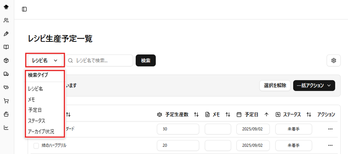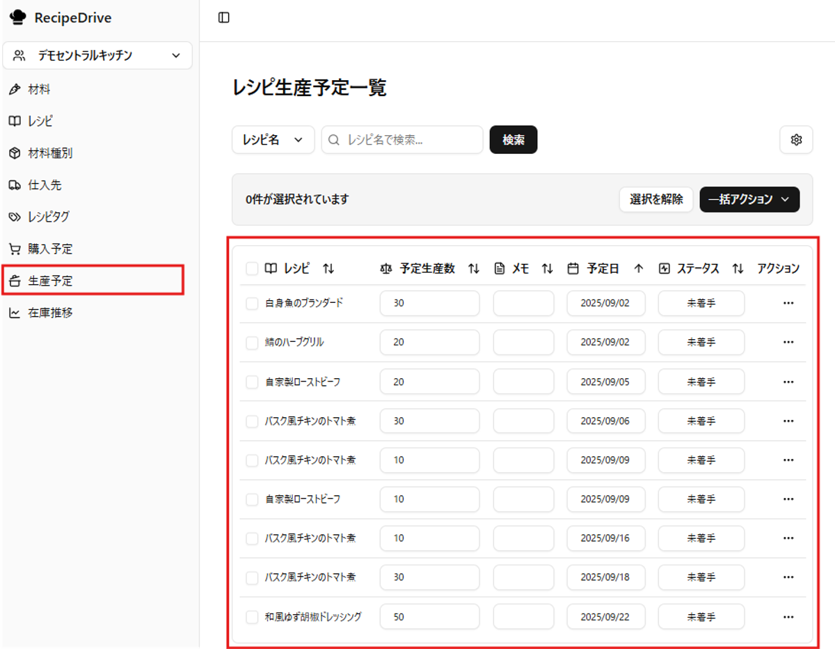 RecipeDriveの生産予定ページでは、当日の仕込み量や進捗をひと目で確認できます。ここでは画面の構成と基本操作を説明します。