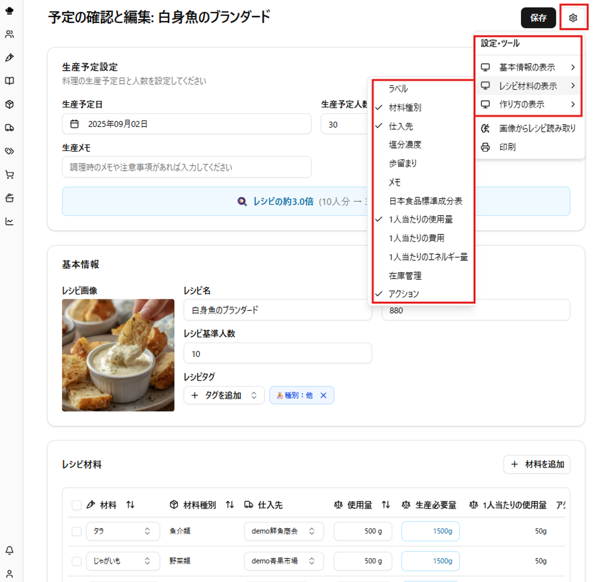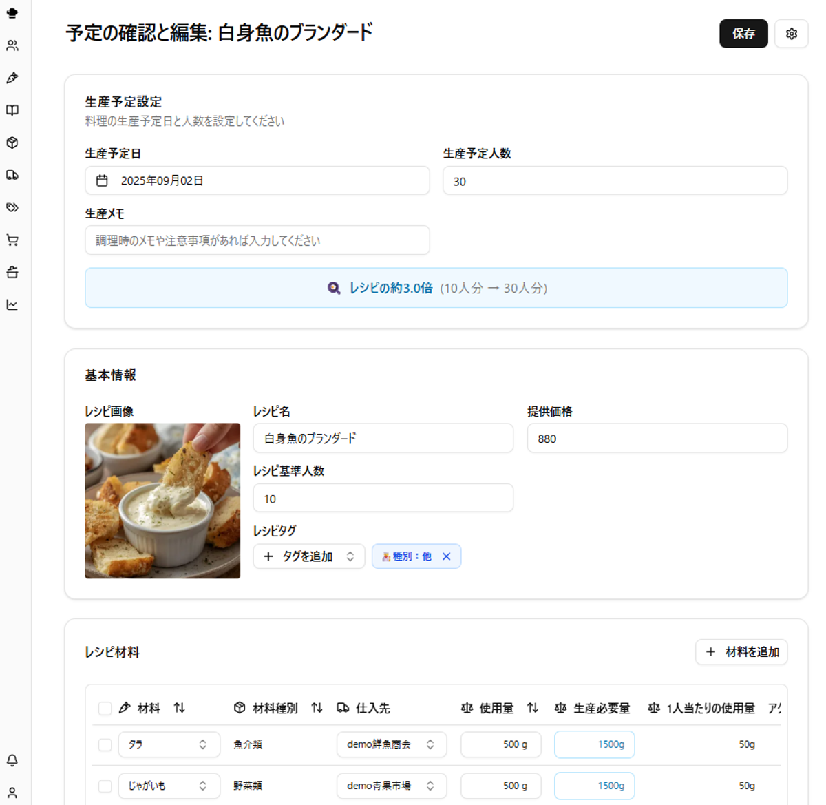 ヒント:このページで使用量を編集して保存しても、元のレシピデータには反映されません(計画・実績の記録用スナップショットです)。