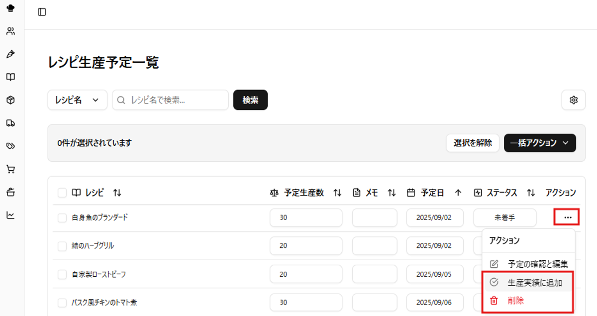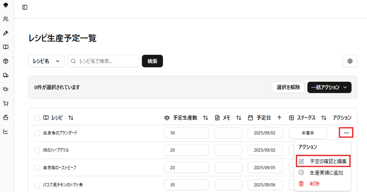 - 各行の右端にあるアクションボタンから、 「予定の確認と編集」 をクリックすると詳細ページが開き、登録時点のレシピと材料使用量を閲覧・編集できます。
