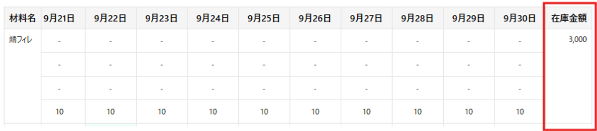- 月末在庫金額(最右列):その月の最終日の当残を、設定中の評価方法で金額換算したものです。