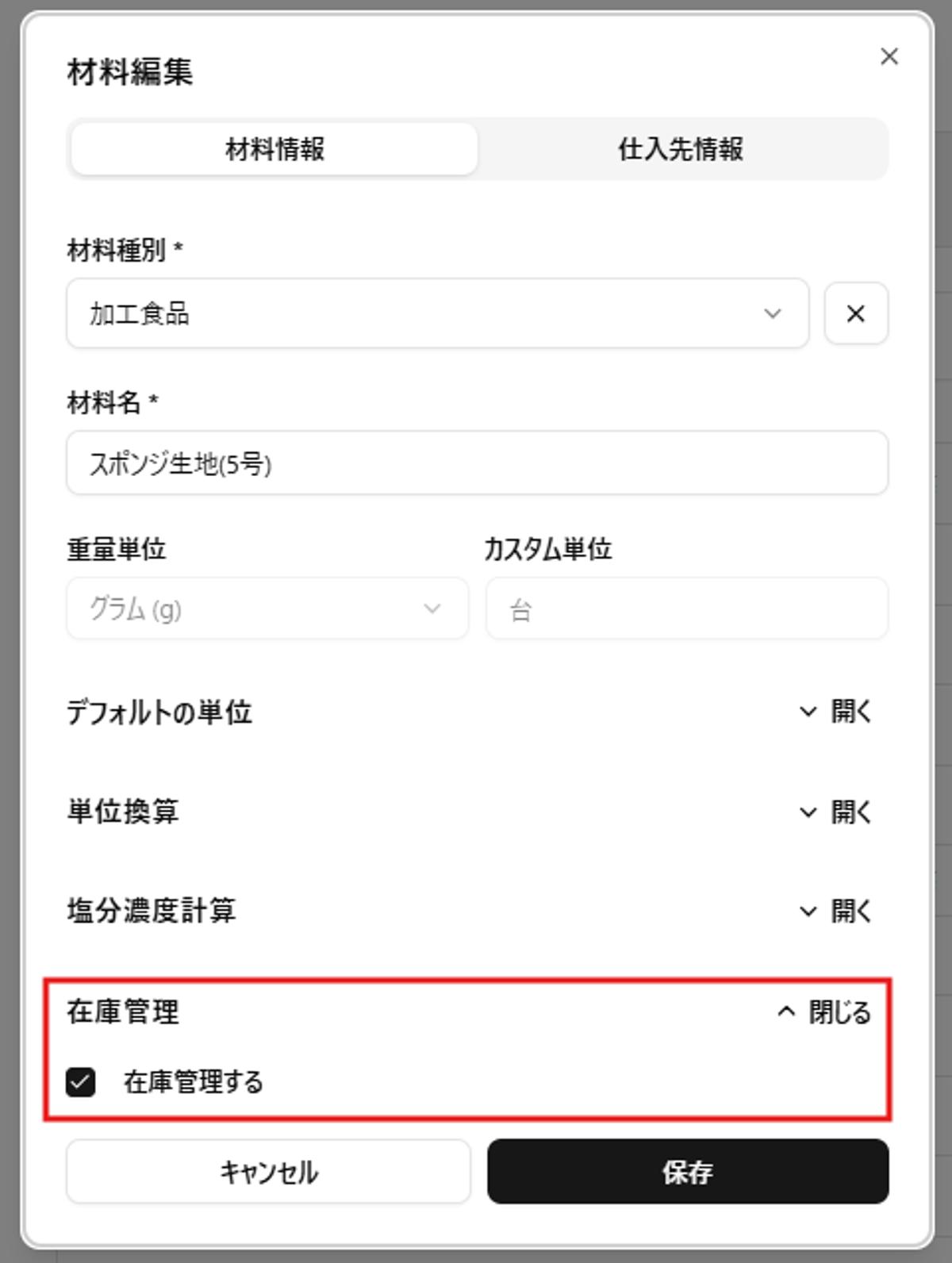 - 在庫管理の単位:材料登録時の単位が表示されます(後からは変更できません)。