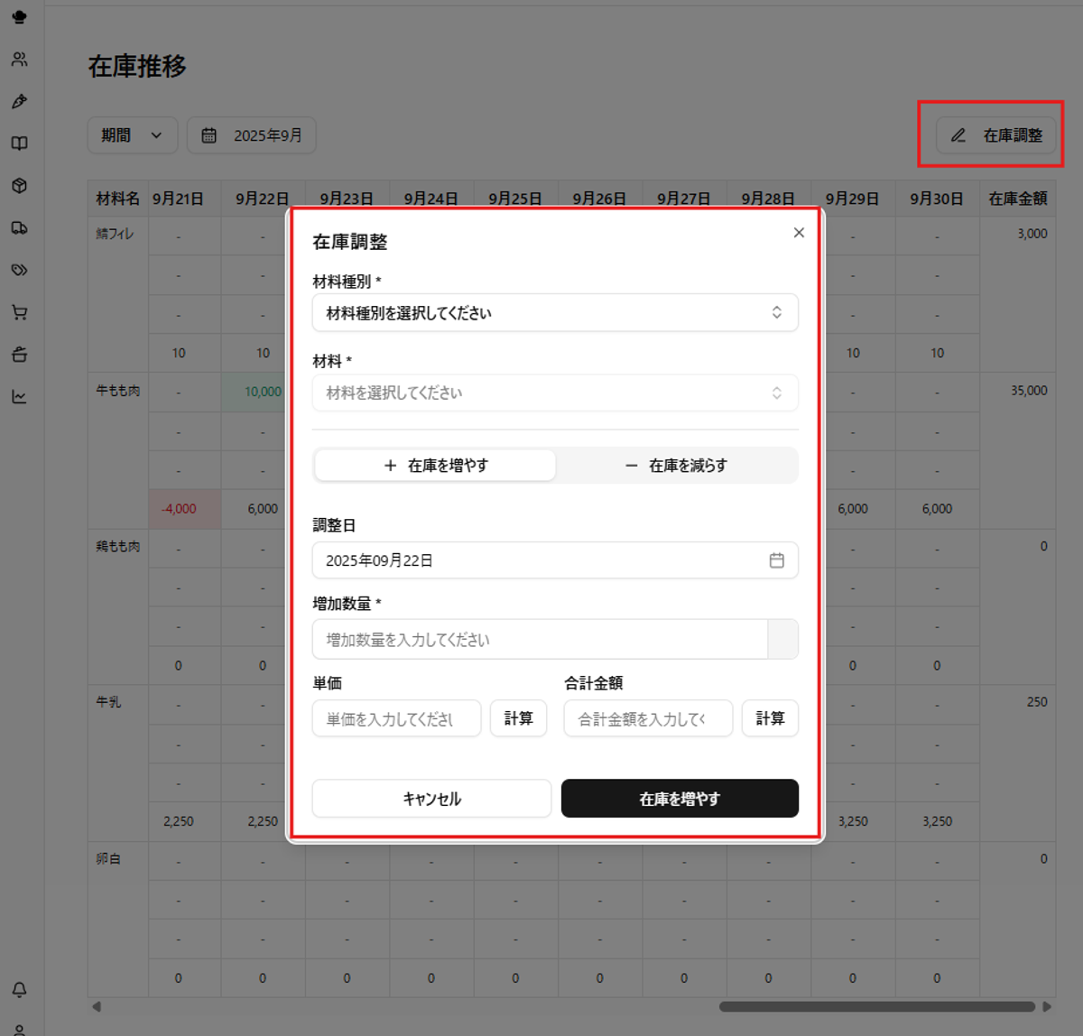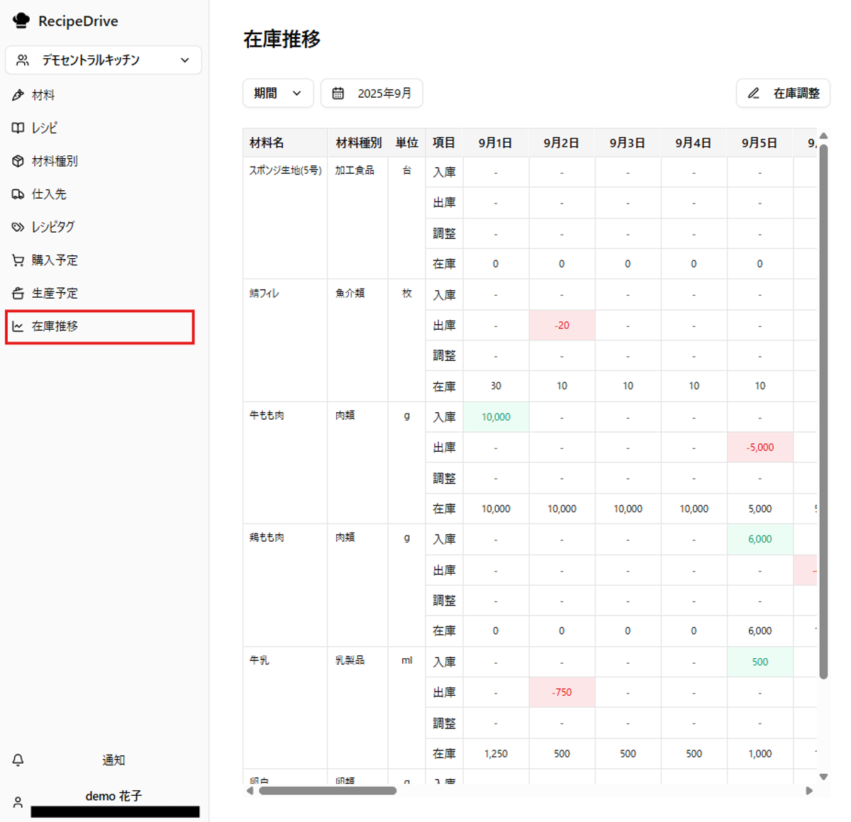 「今日の在庫はいくら残ってる?」——RecipeDriveの在庫推移ページを使えば、そんな疑問をすぐに解消できます。ここでは画面の見方や数量の調整方法まで、基本的な操作方法を説明します。