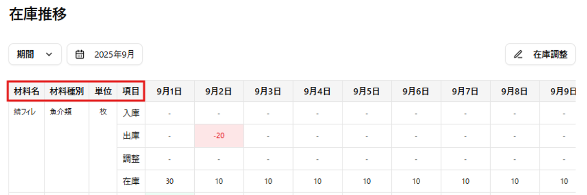 - 在庫推移ページに表示されるのは、材料設定で「在庫管理する」にチェックを入れている材料 だけです。