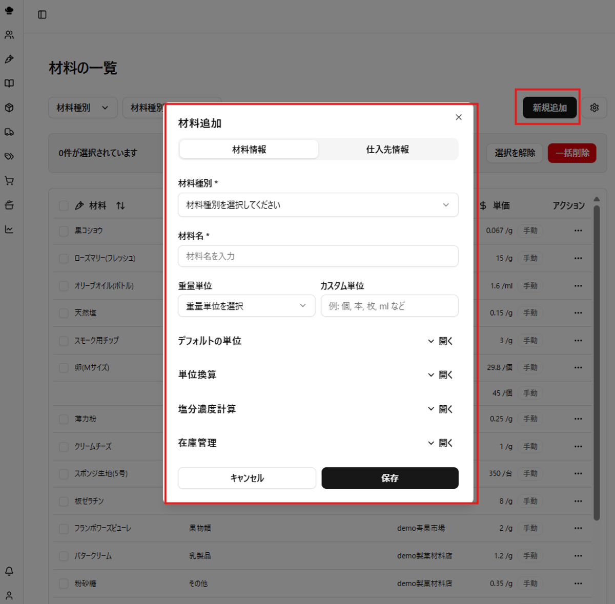 必須項目 は「材料名」「材料種別」「単位」の3つです。