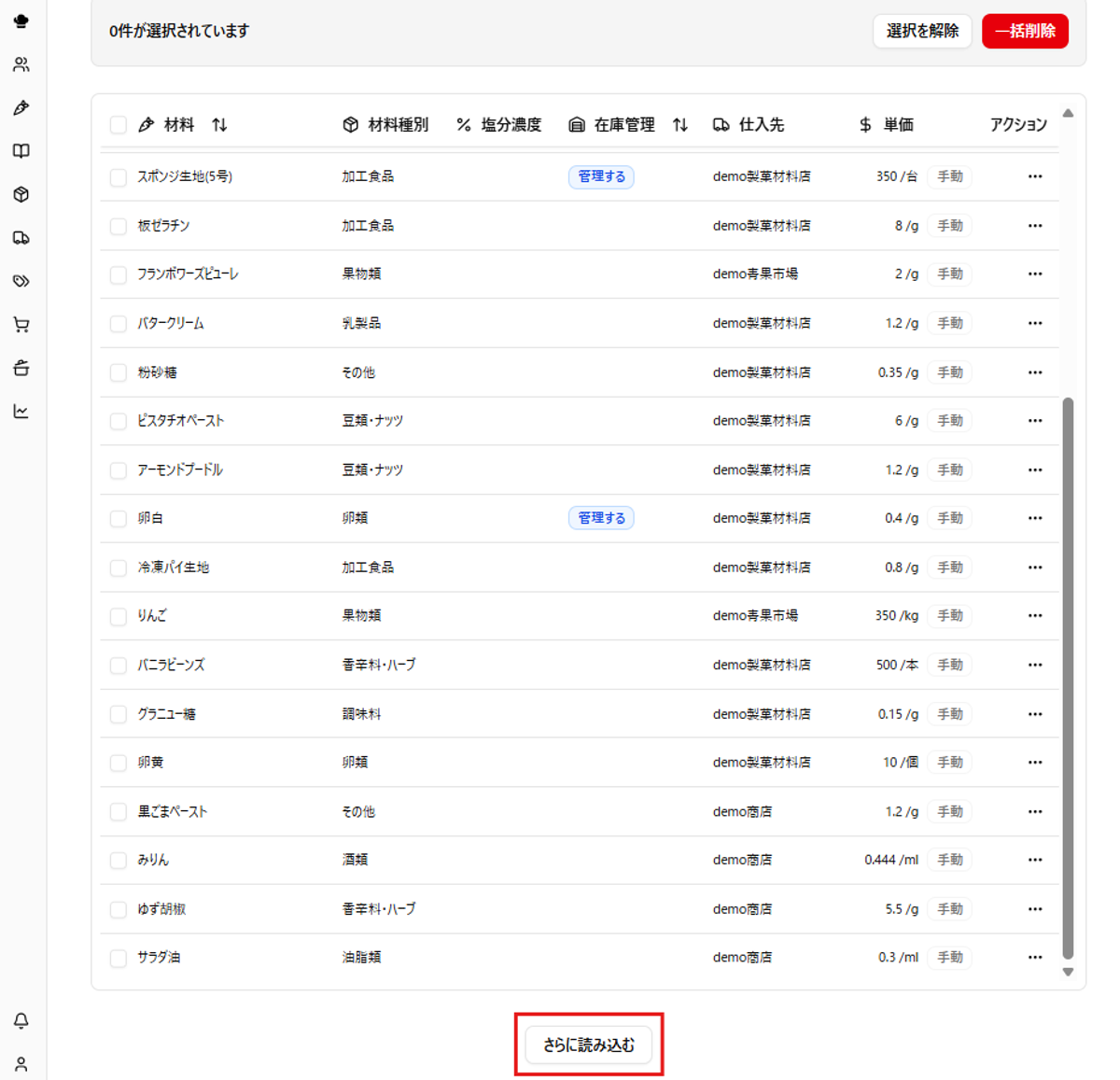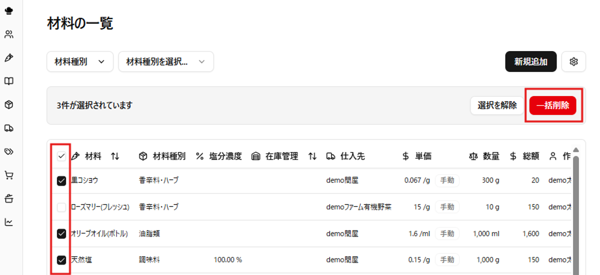 1. 一覧左端のチェックボックスで削除したい材料を選択します。