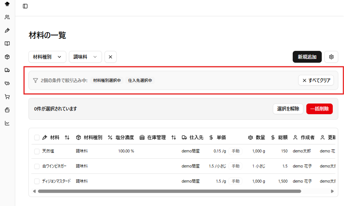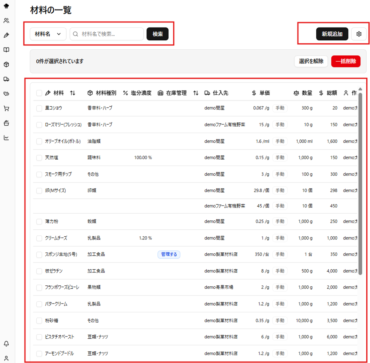 - 左上:検索メニュー(材料名検索ボックス・種別フィルター・仕入先フィルター)