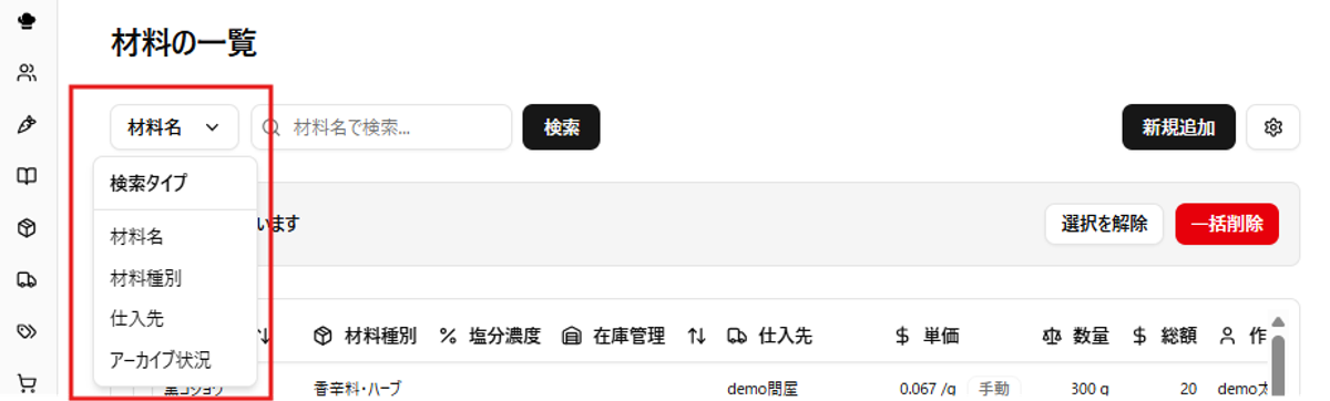 - 検索タイプは 「材料名」、「材料種別」、「仕入先」、「アーカイブ状況」 の4種類があります。