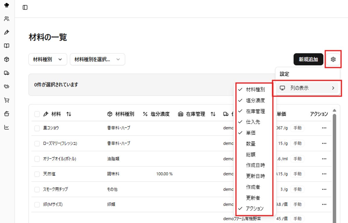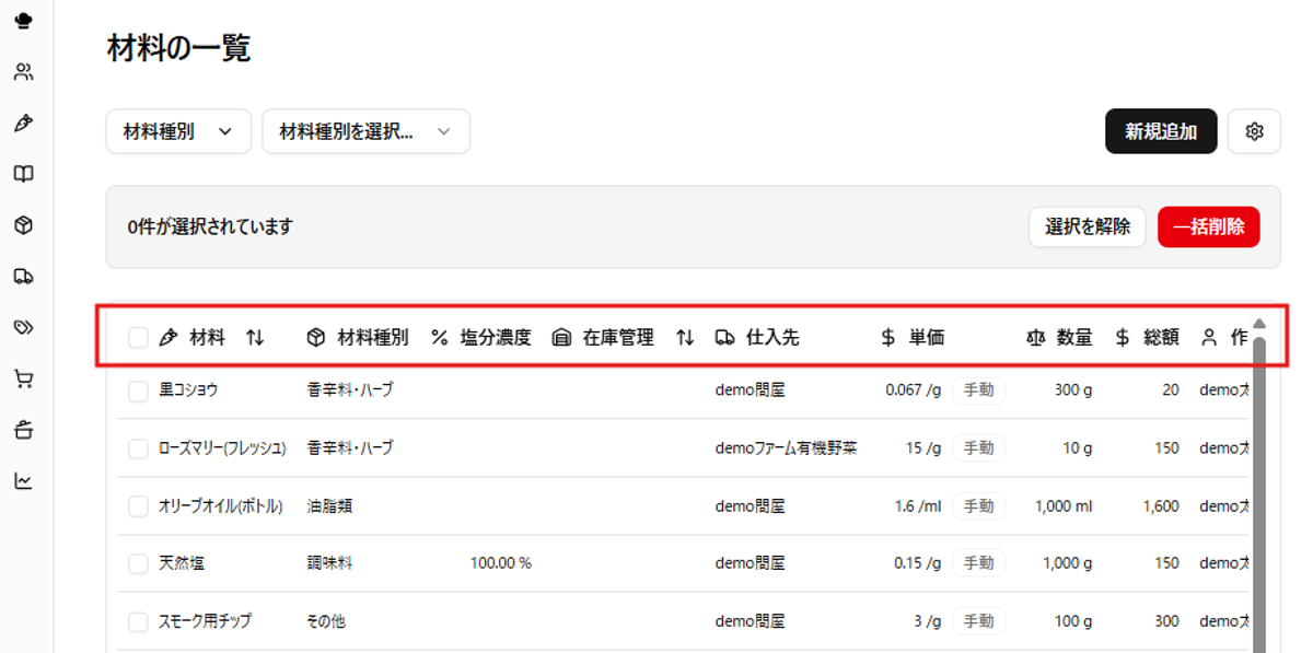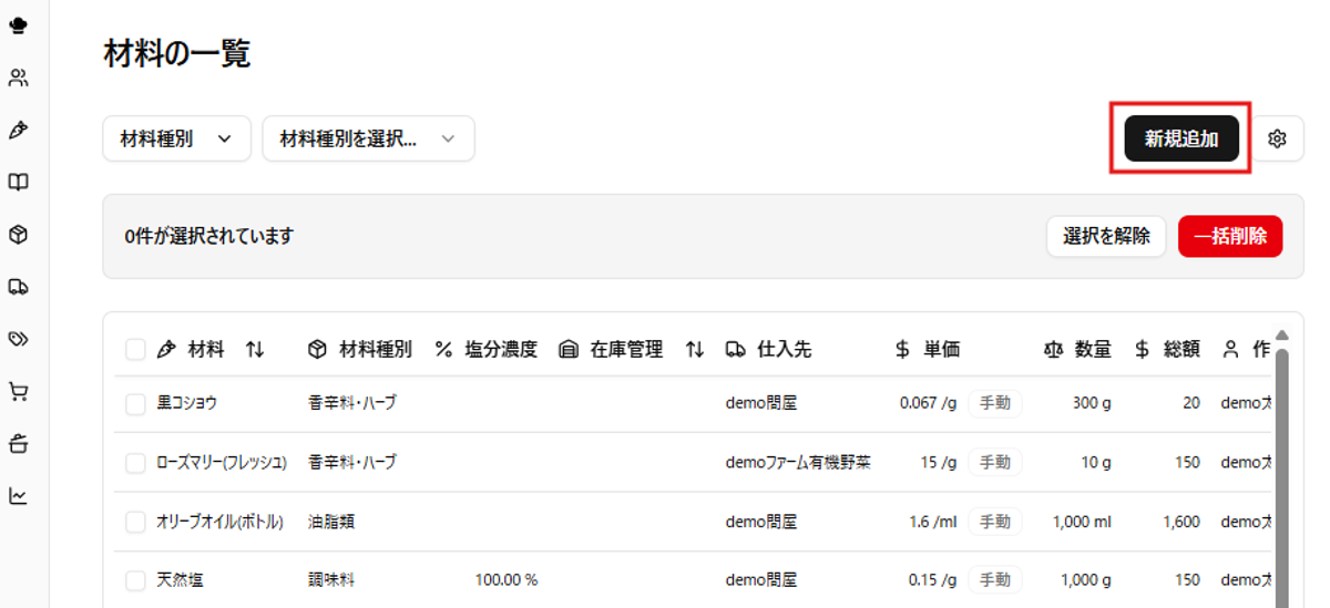右上の 「新規追加」 ボタンを押すと登録フォームが開きます。詳しい手順は 「材料を新規登録する方法」 を参照してください。