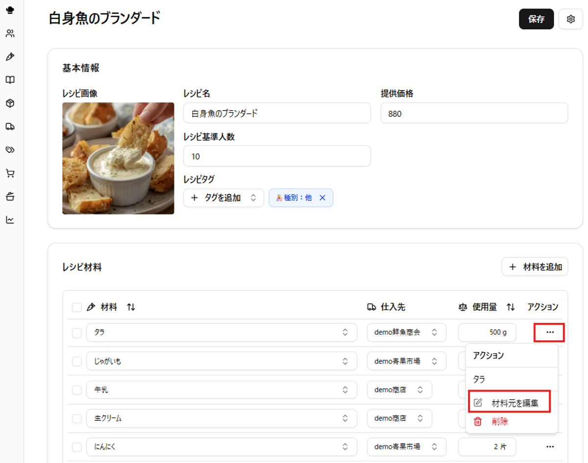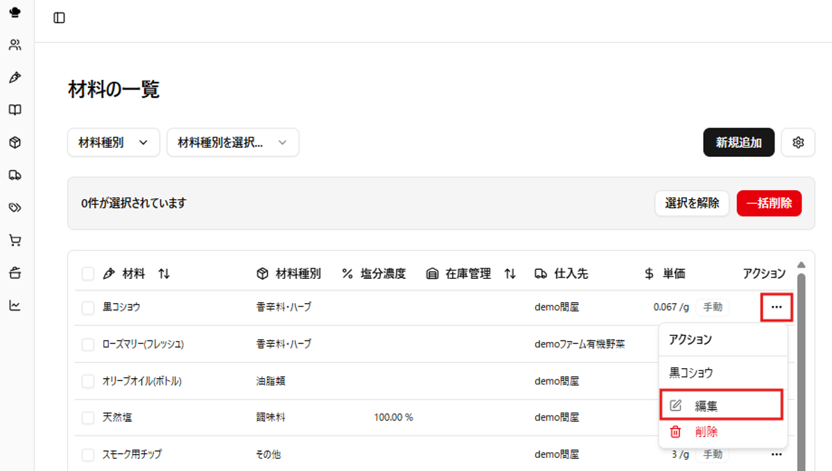 - 一覧から該当する材料の アクションボタン(︙) をクリックし、「編集」 を選択します。