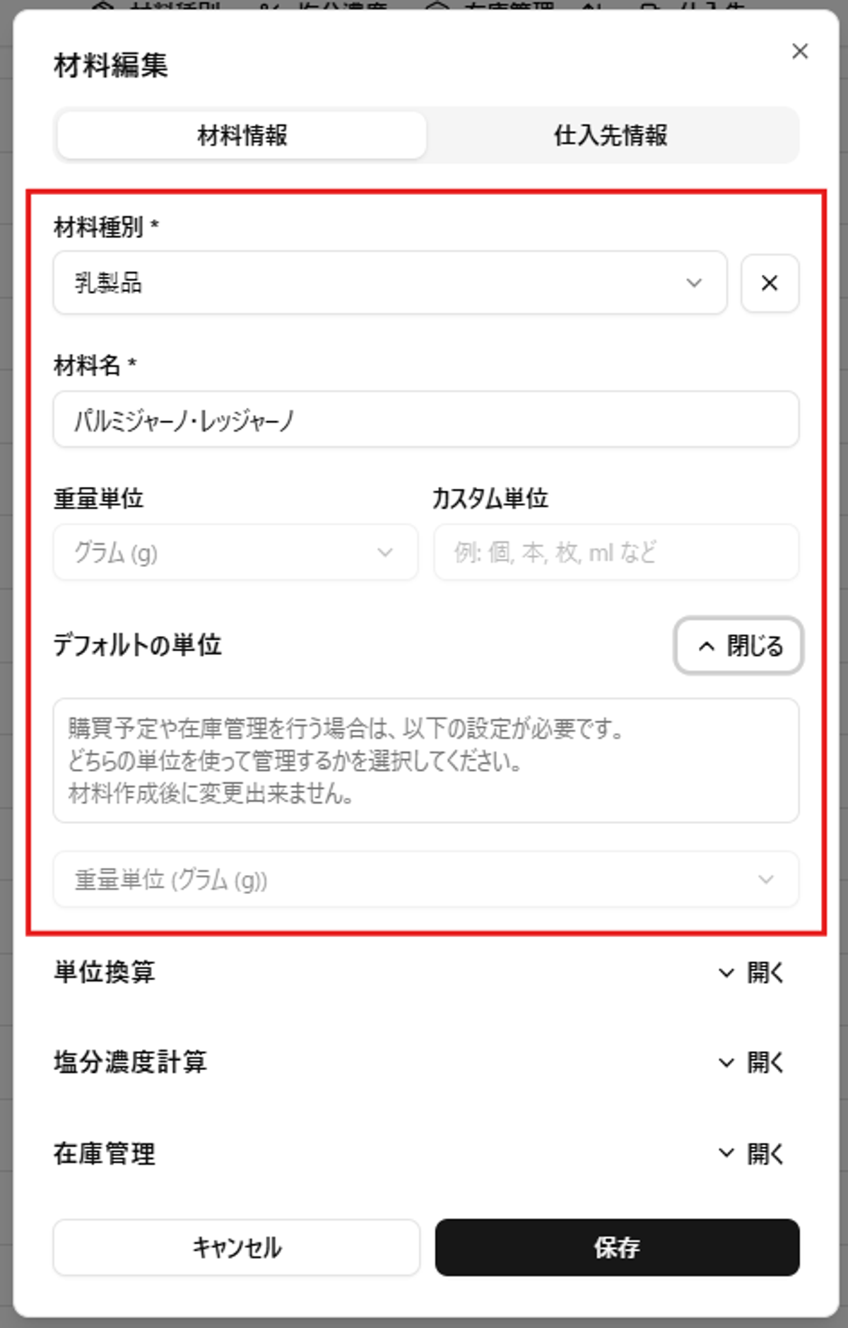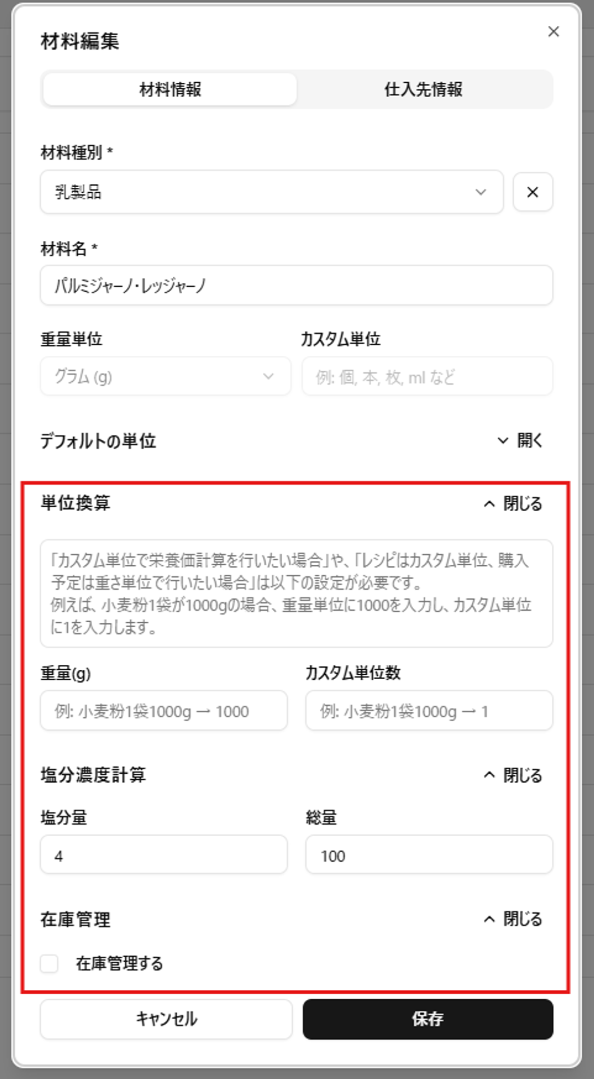 - 栄養価や塩分濃度計算には重量単位が必須ですが、カスタム単位を使う場合でも換算値を設定することで両方に対応できます。