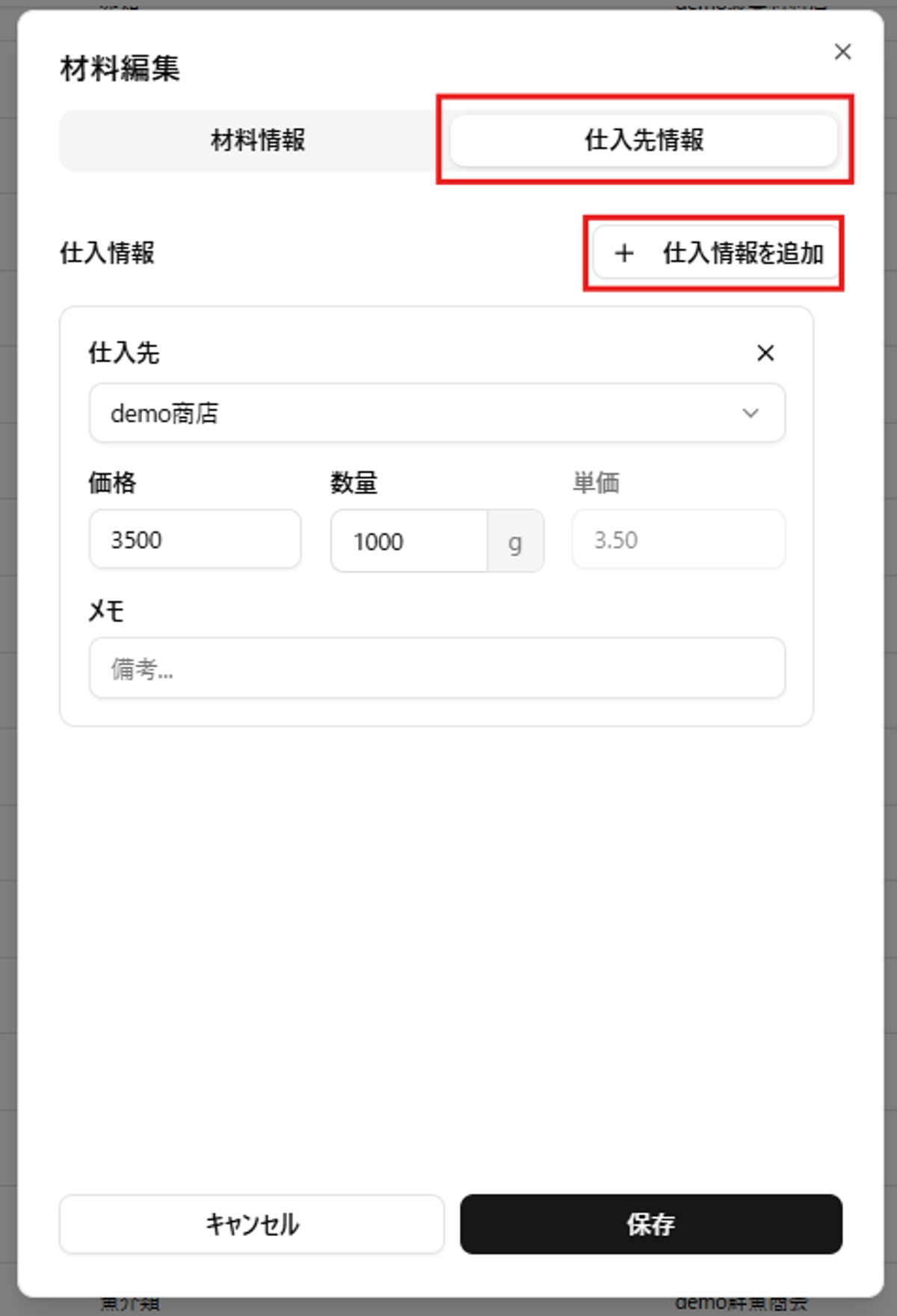 - 仕入先名や価格などの情報を登録できます。