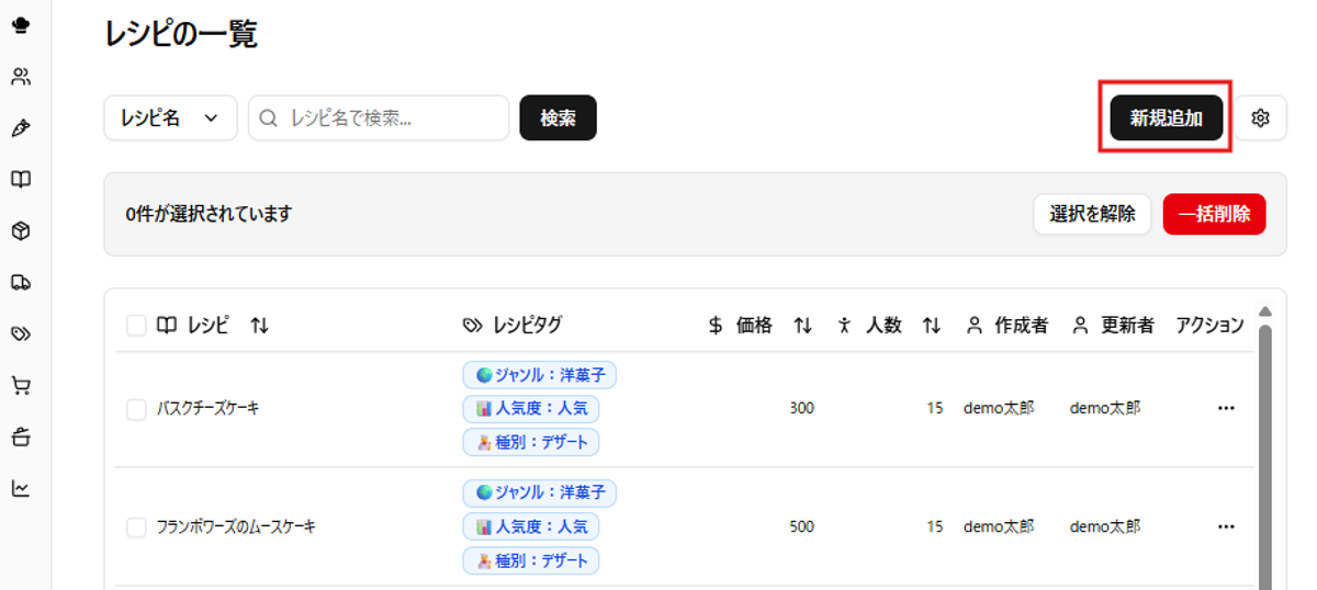 - レシピ一覧ページから:右上の 「新規登録」 ボタンをクリックします。