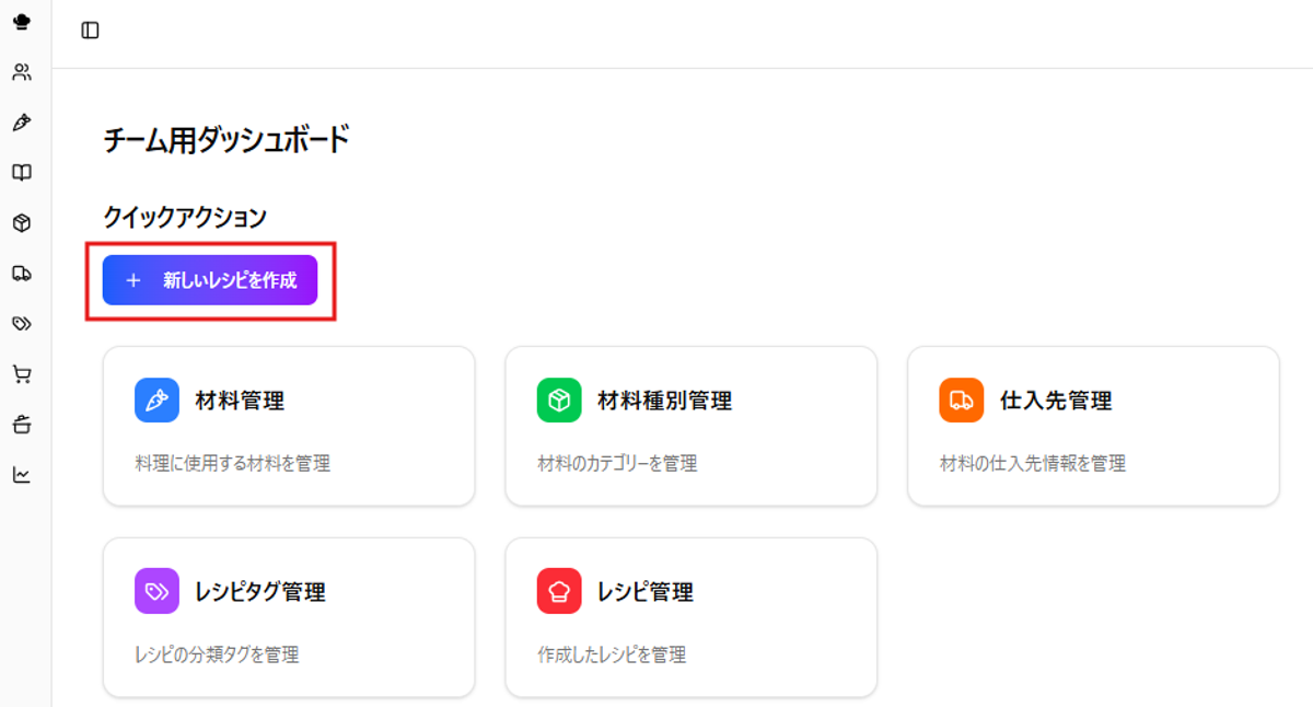 - ダッシュボードから:画面左上のクイックアクセスの 「新しいレシピを作成」 をクリックします。