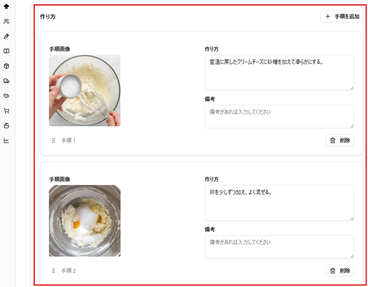 レシピ作成ページの詳細は「レシピ作成ページの見方と基本操作」をご覧ください。