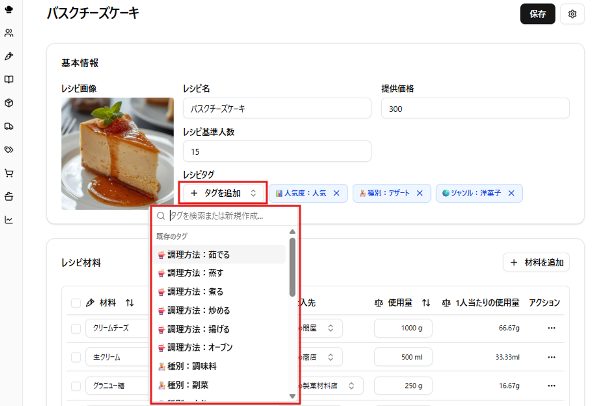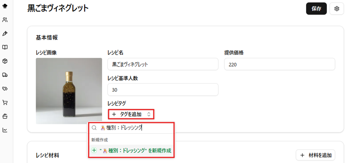 - 基本情報エリア – レシピ作成ページの左側「基本情報」で レシピタグ ボックスをクリックします。