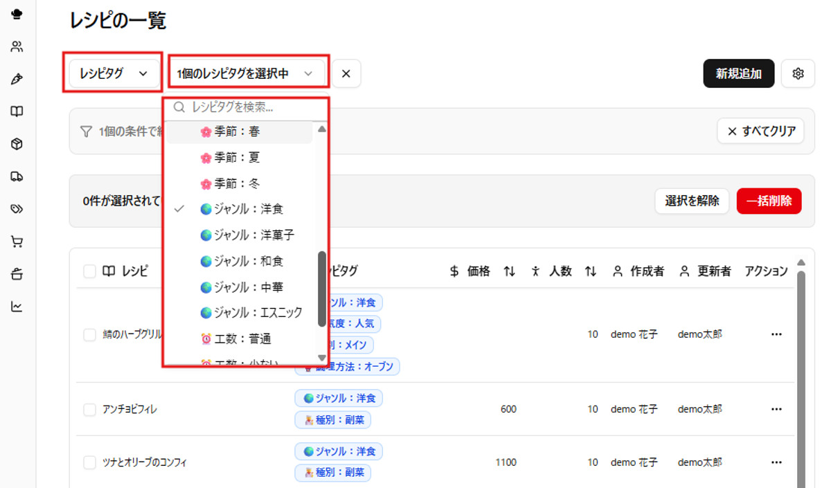 - 複数タグフィルター – 例えば「メイン料理」×「春」×「洋食」のように組み合わせ検索も可能です。