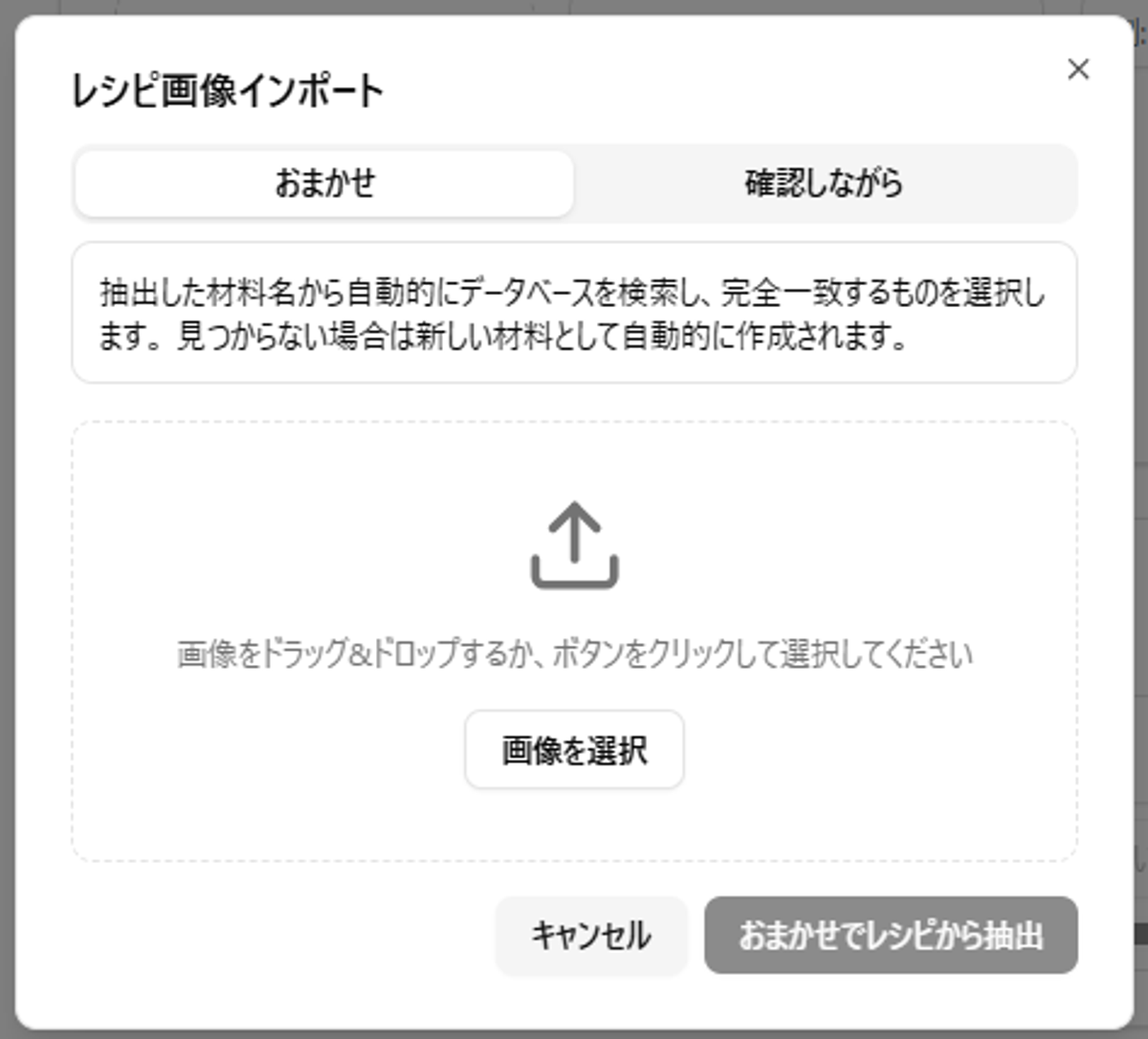 - 「確認しながら」取り込み:抽出された材料を1つずつ確認しながら手動でマッチング。材料選択を細かく調整したいときに便利です。
