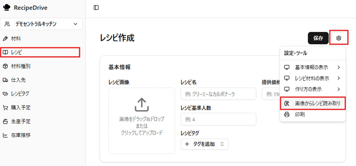- 作成ページ右上の ツールボタン をクリックし、「画像からレシピを読み取り」 を選択します。