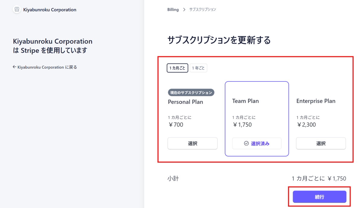 「サブスクリプションを更新」をクリックし、希望するプランを選択して「続行」をクリックします。