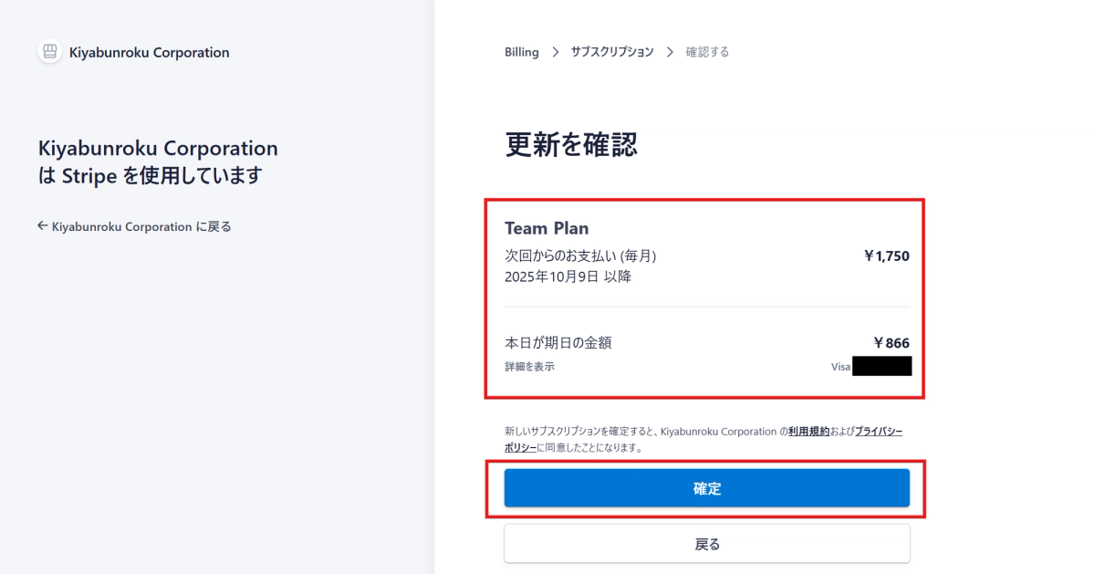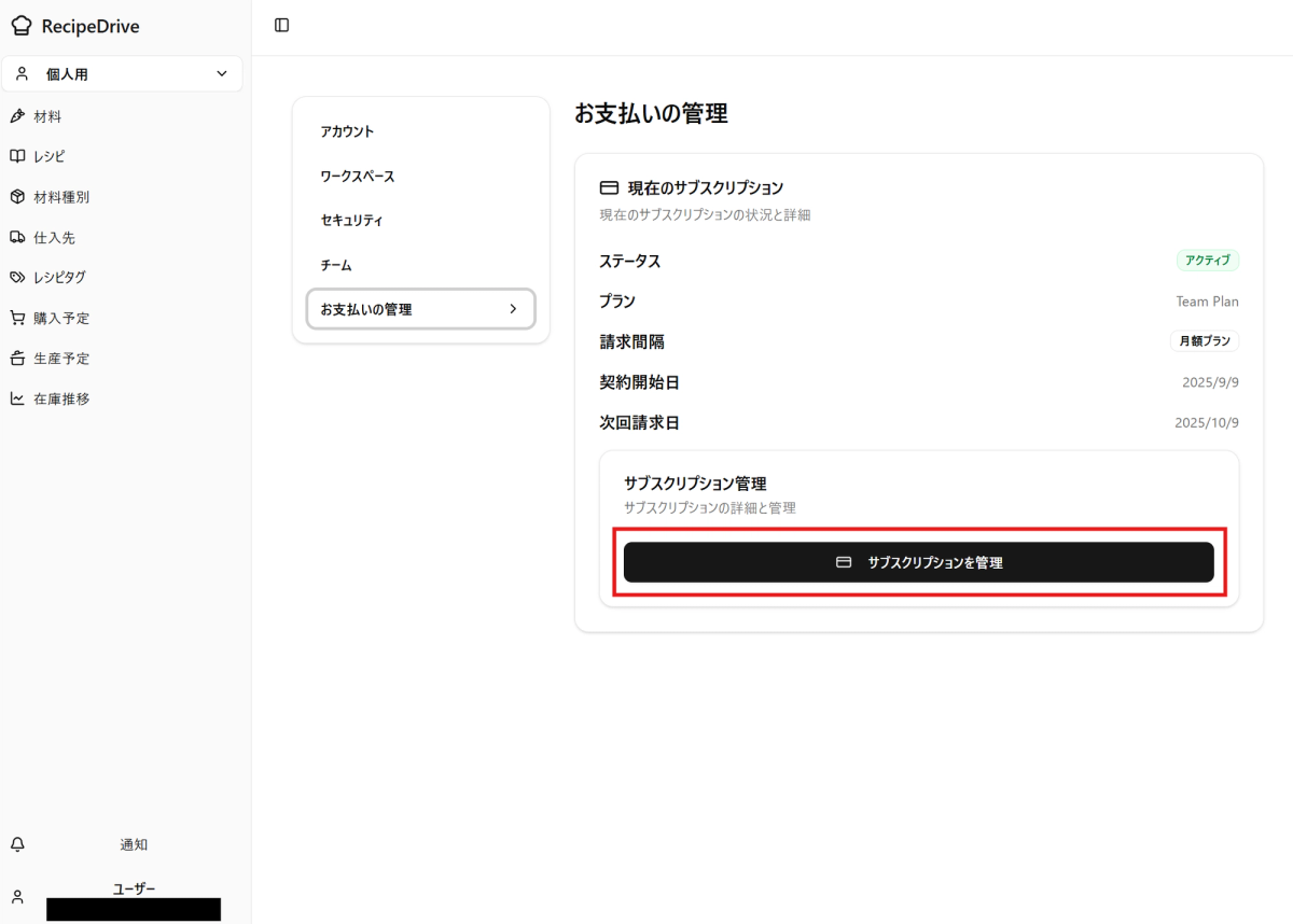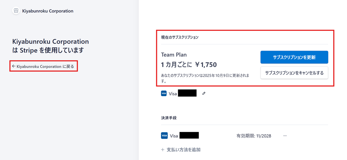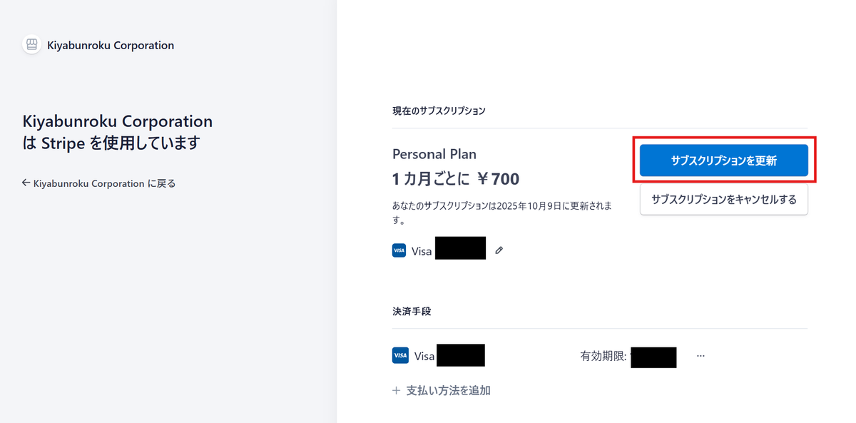 サブスクリプション管理エリアで「サブスクリプションを管理」をクリックすると、Stripeの管理ページが開きます。