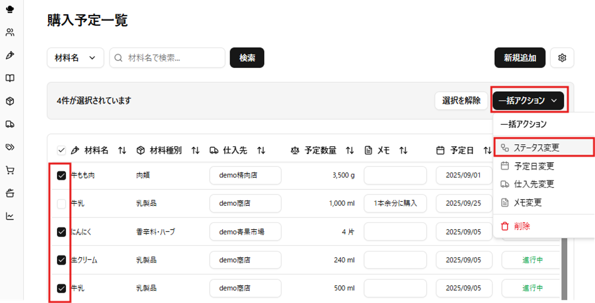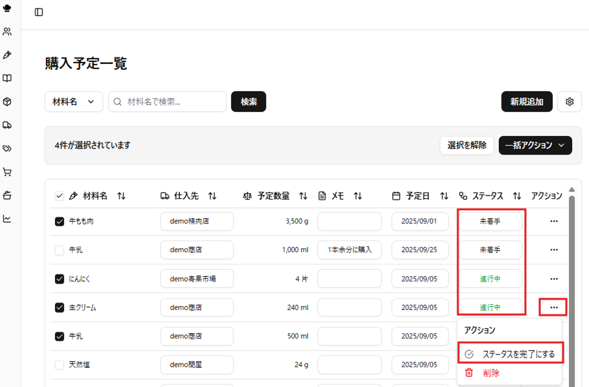 - 材料・仕入先・レシピ・作成者・更新者・予定日・ステータス 列は並び替え可能です。