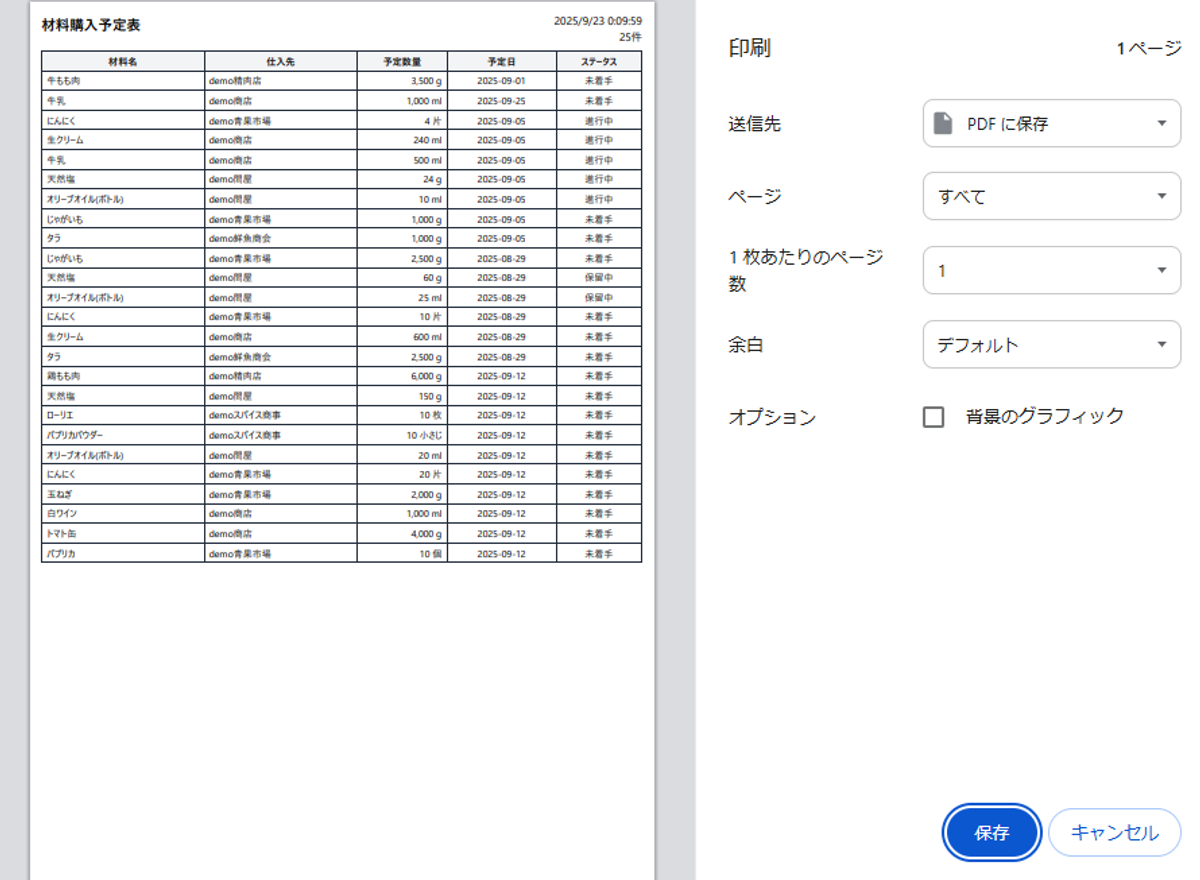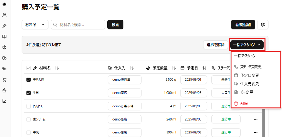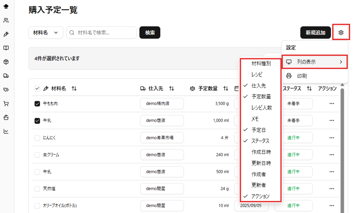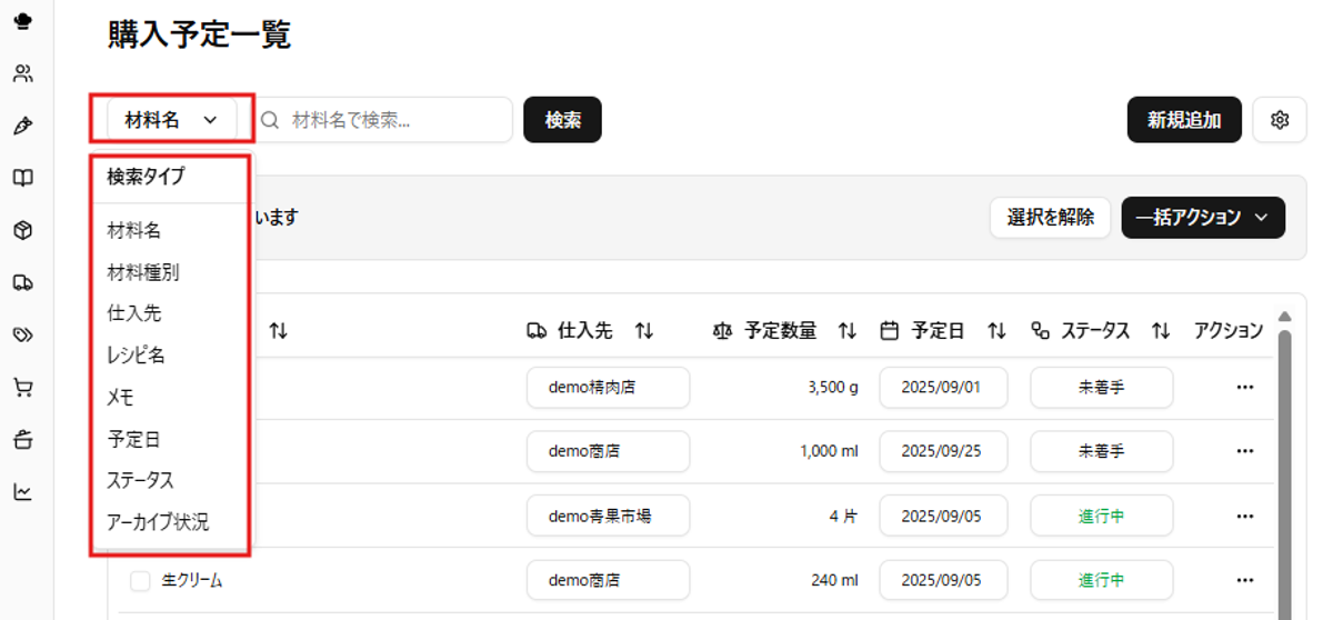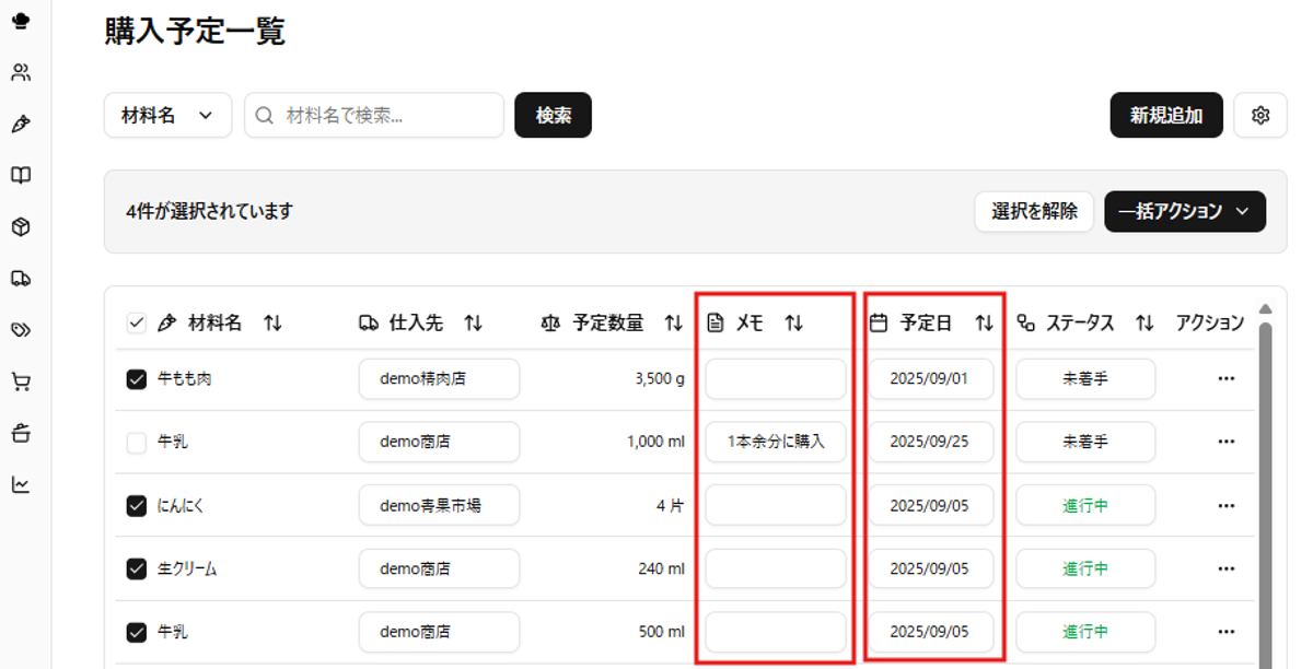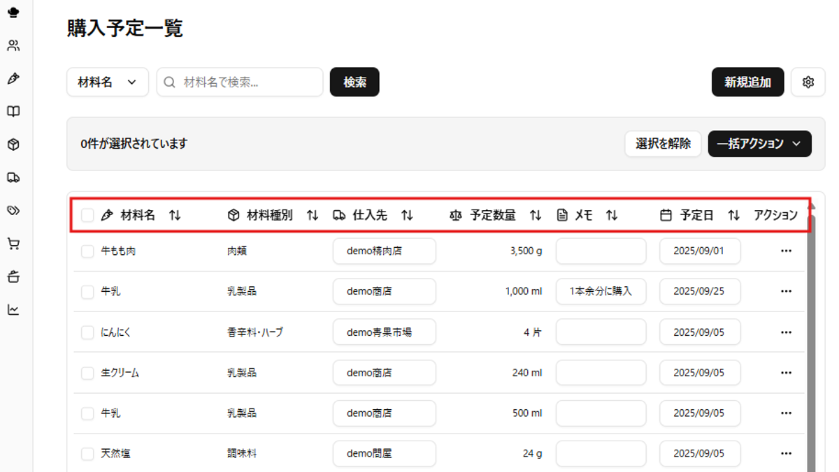 - 対応項目:材料種別、レシピ、仕入先、予定数量、レシピ人数、メモ、予定日など