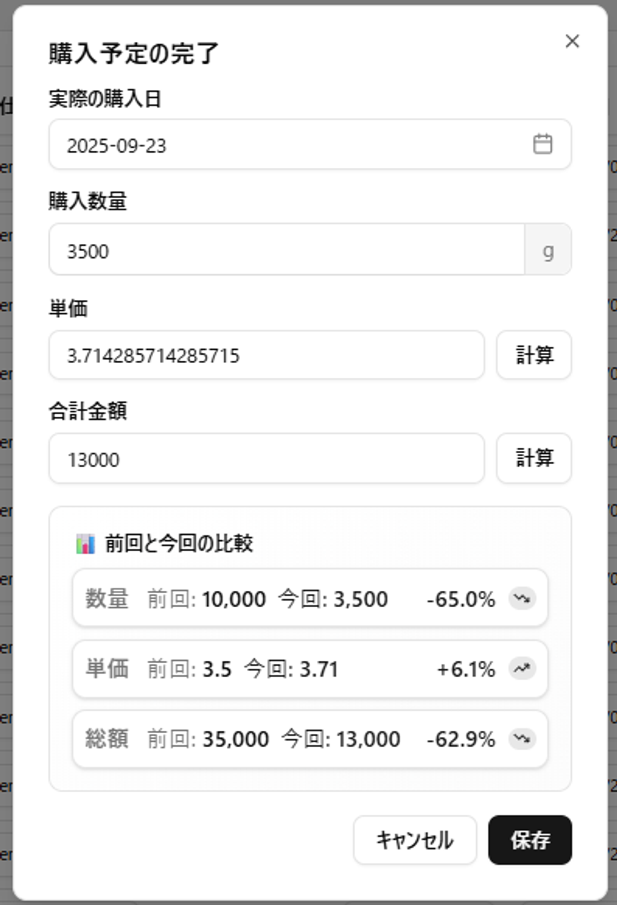 ステータスを 「完了」 にする際は 実際の購入量と価格 を入力してください。