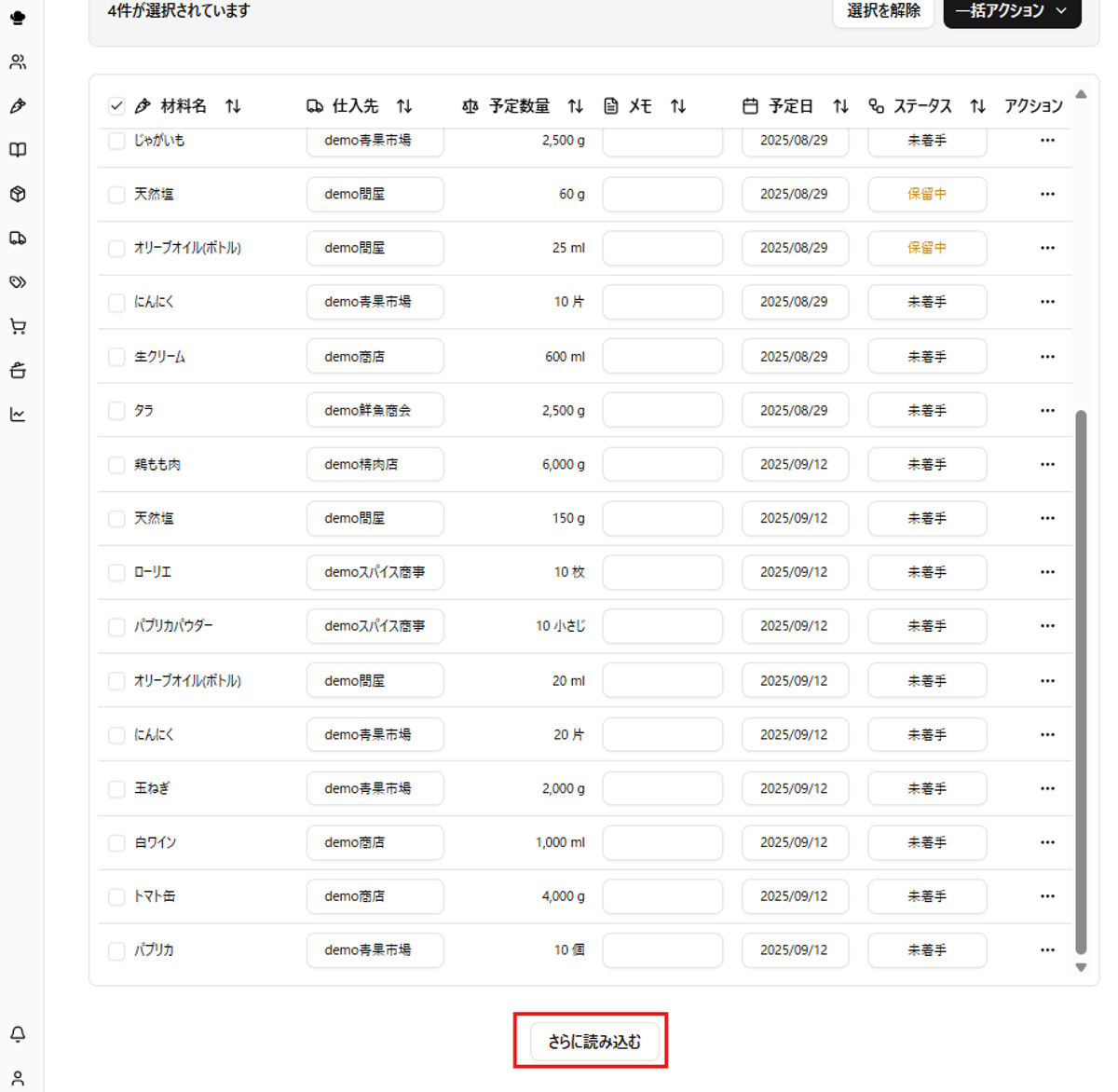 - 右下の 「さらに読み込む」 ボタンで、次の25件を追加読み込みできます。大量データの管理時にご利用ください。