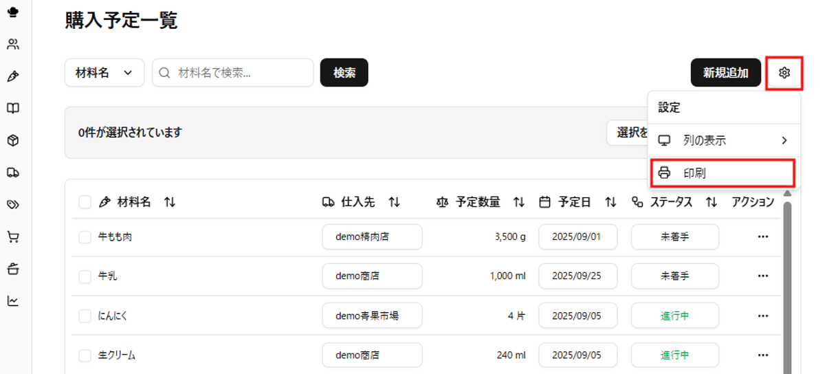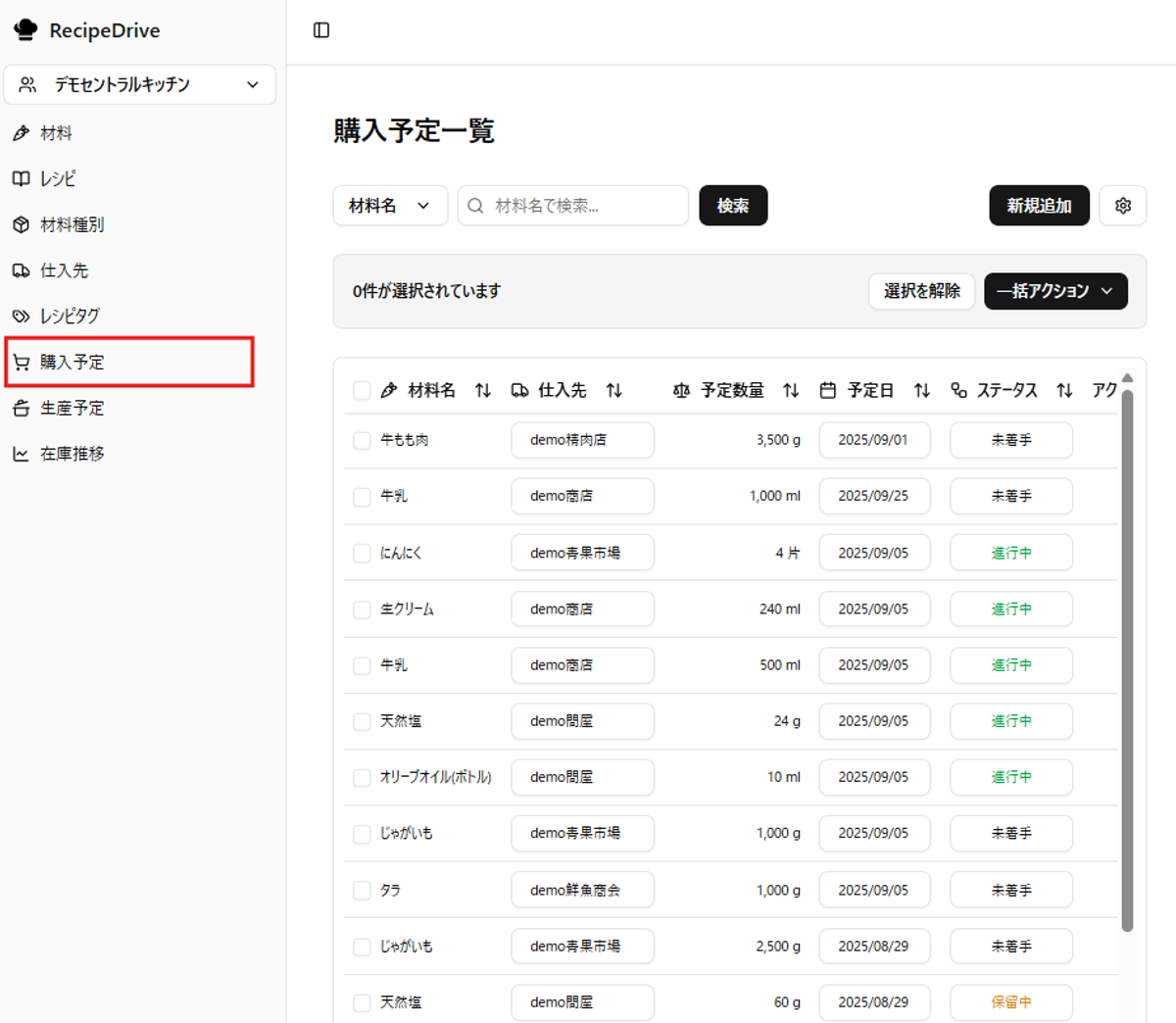 RecipeDriveの購入予定ページでは、仕入れ予定の材料を一元管理できます。ここでは画面の各エリアの役割と、ステータス変更や並び替えなど基本操作のポイントをご説明します。